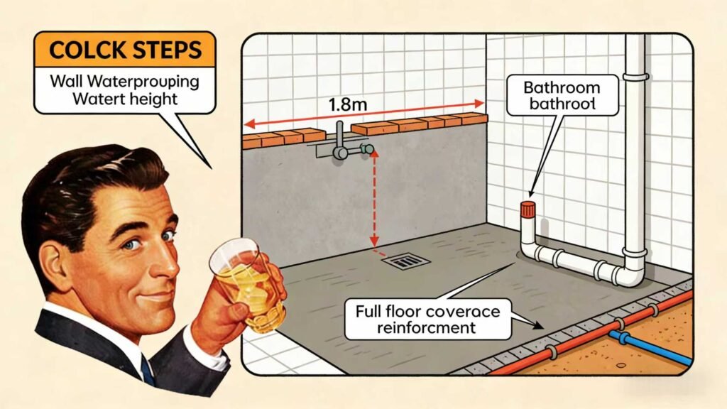 Waterproofing is critical. Key details: Shower area walls need waterproofing up to 1.8m, non-shower areas 1.5m, and full floor coverage. Apply 2-3 coats of waterproof paint, with a 24-hour water test after each coat. Strengthen waterproofing at pipe junctions, a high-leakage area.