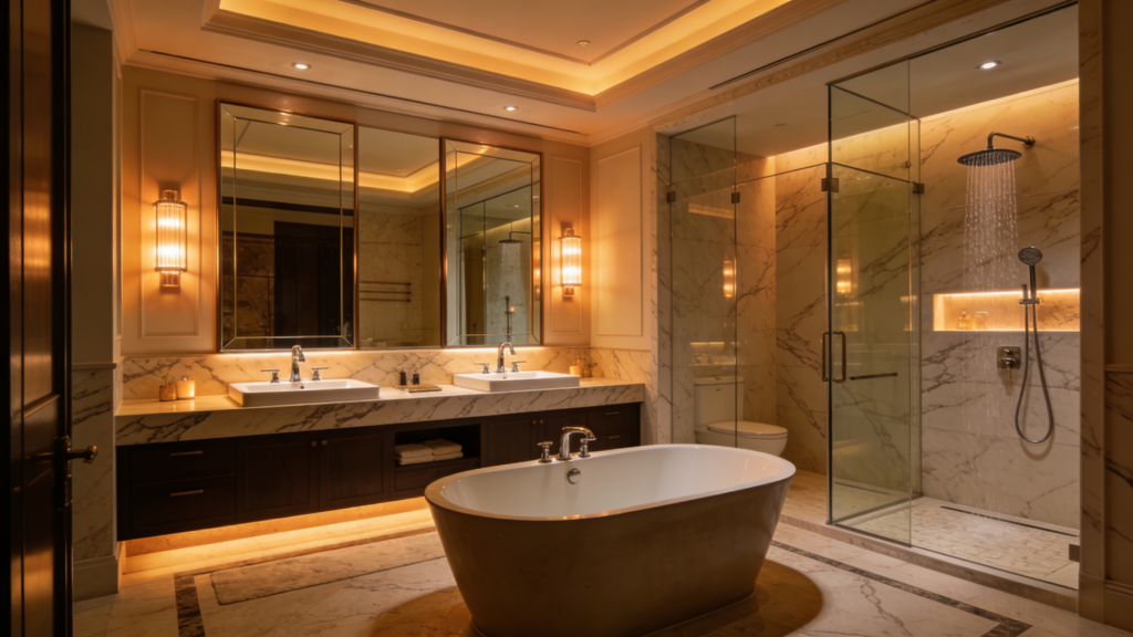 Install freestanding bathtubs, double-sink vanities with smart storage, high-end voice-controlled smart toilets, and multi-function shower sets (overhead, handheld, side spray).