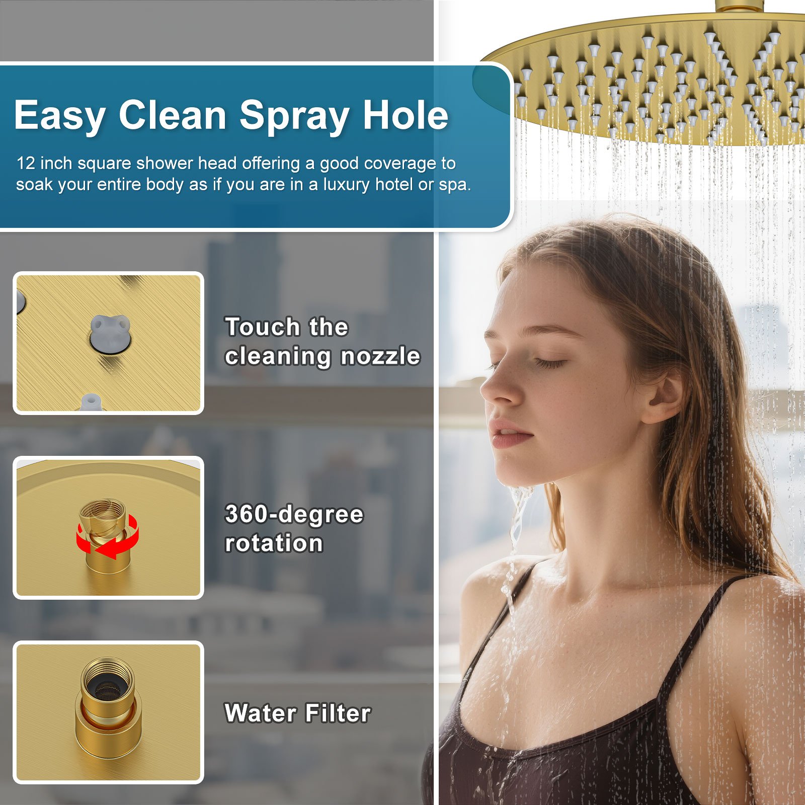 Crafted from premium materials, this brushed gold shower head ensures durability and long-lasting performance. Its 12-inch round design provides an expansive water flow, perfect for full-body coverage. The corrosion-resistant brushed gold finish not only adds aesthetic appeal but also reduces the buildup of watermarks and stains, ensuring the appliance stays pristine and easy to maintain over time.