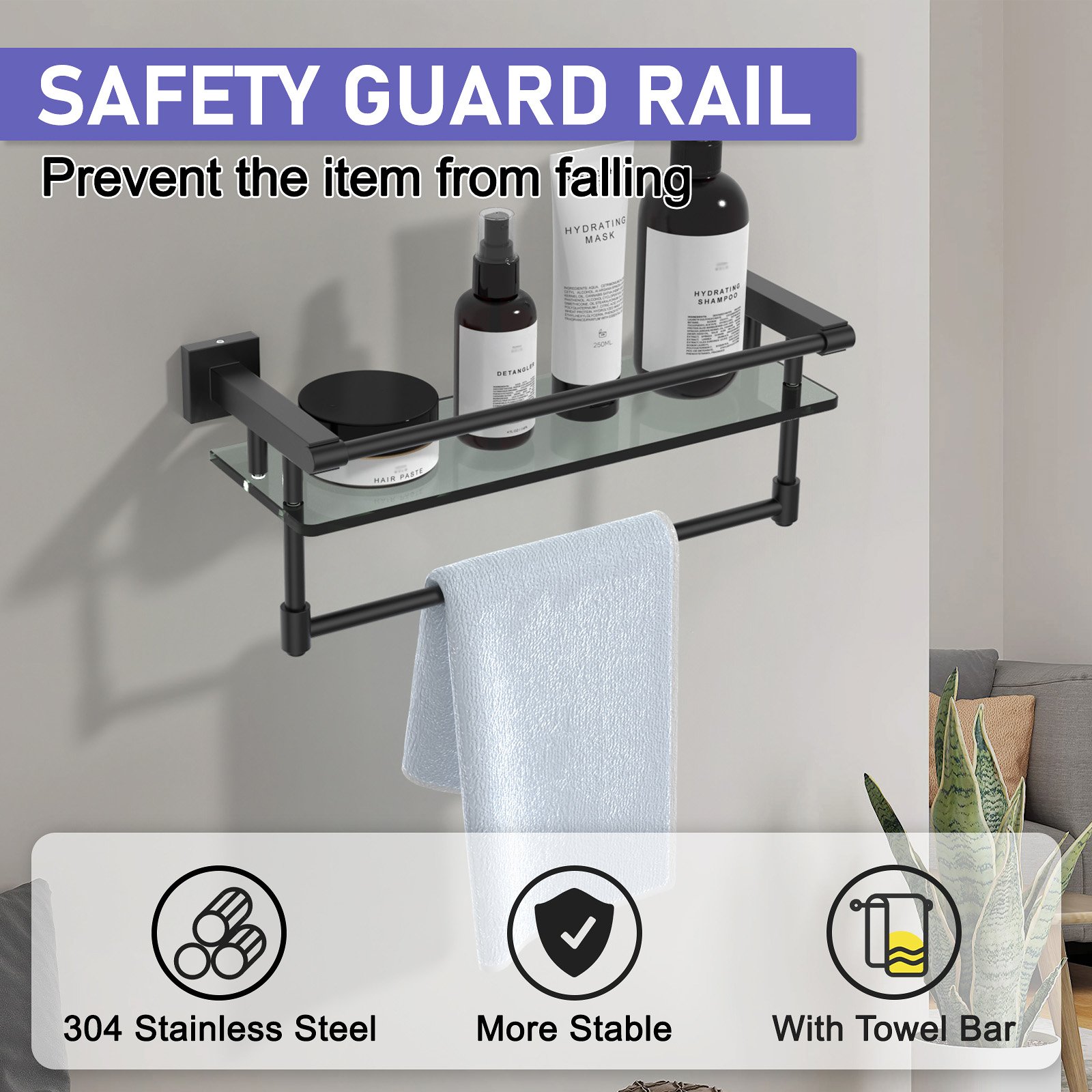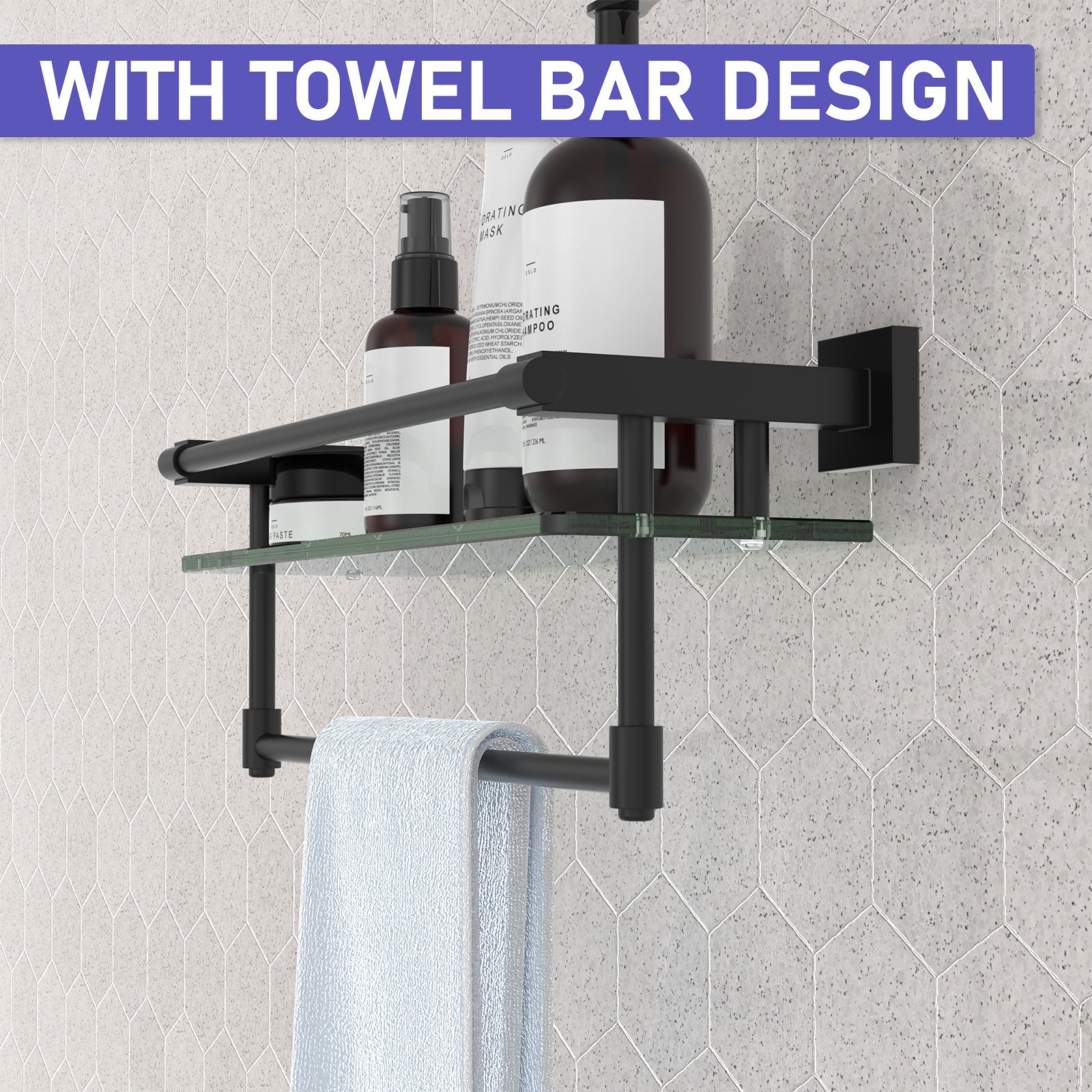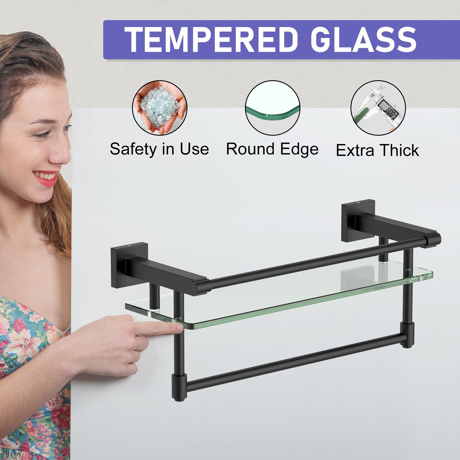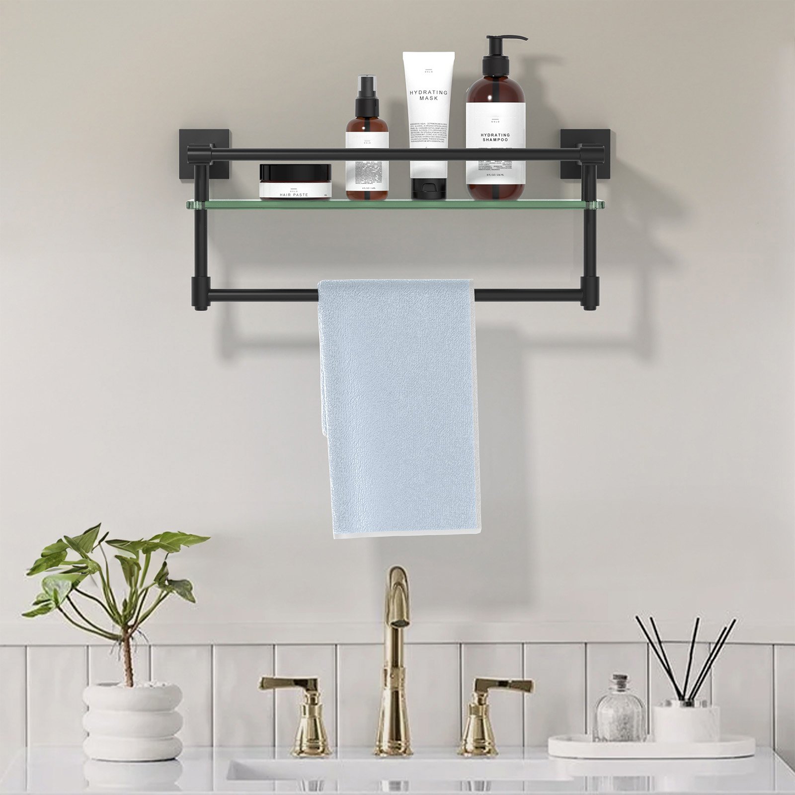 The 16-inch hanging rod in matte black with a glass shelf merges modern design with practicality, offering a perfect solution for both storage and style enthusiasts. Whether you’re revamping your bathroom, walk-in closet, or entryway, this piece instantly adds a premium touch to your space. Its bold matte black finish accentuates your interior while maintaining a timeless and minimalist aesthetic.