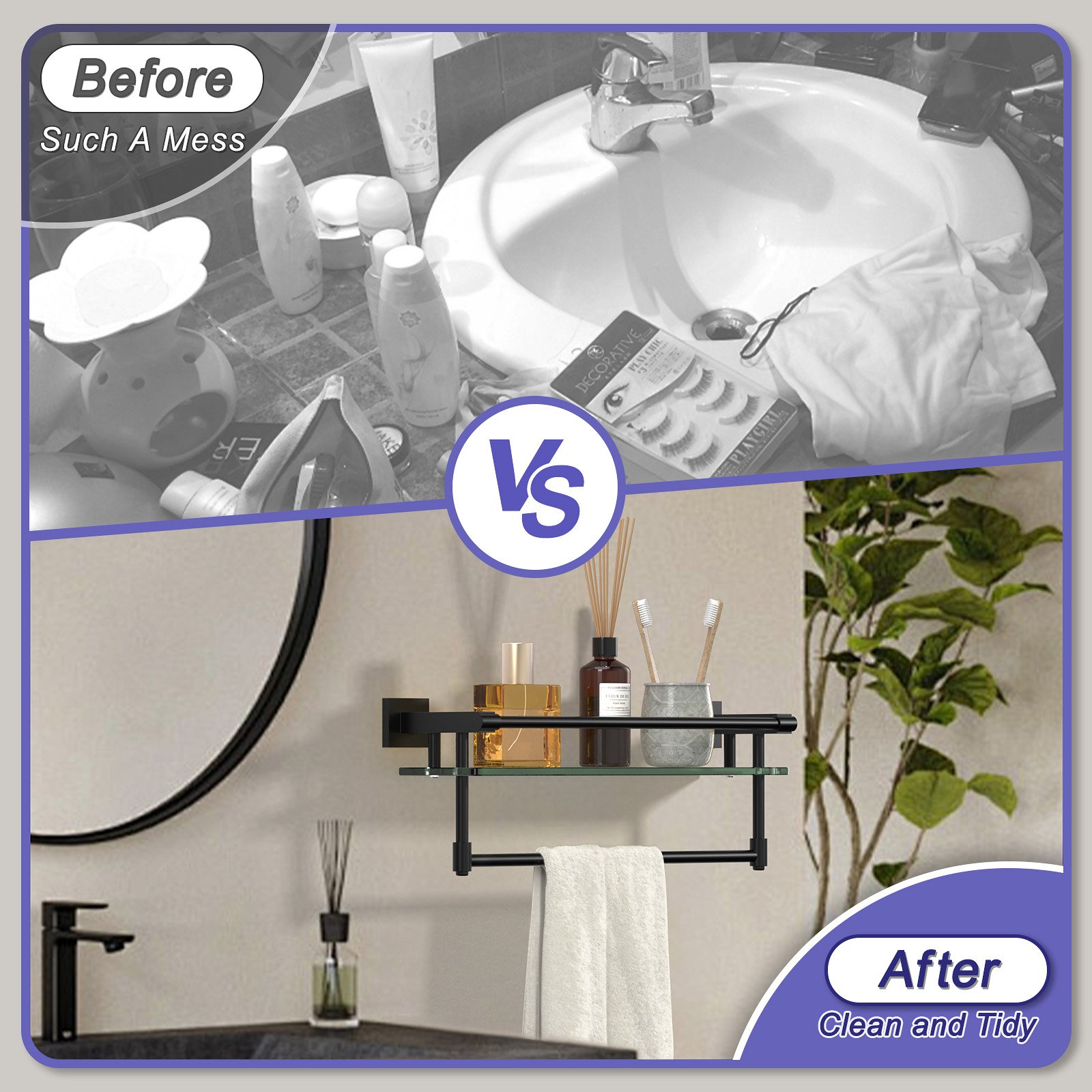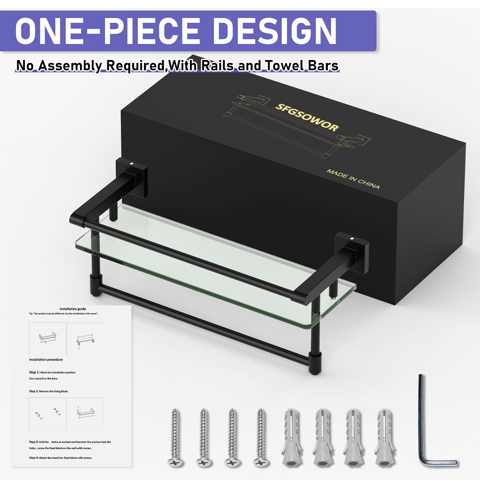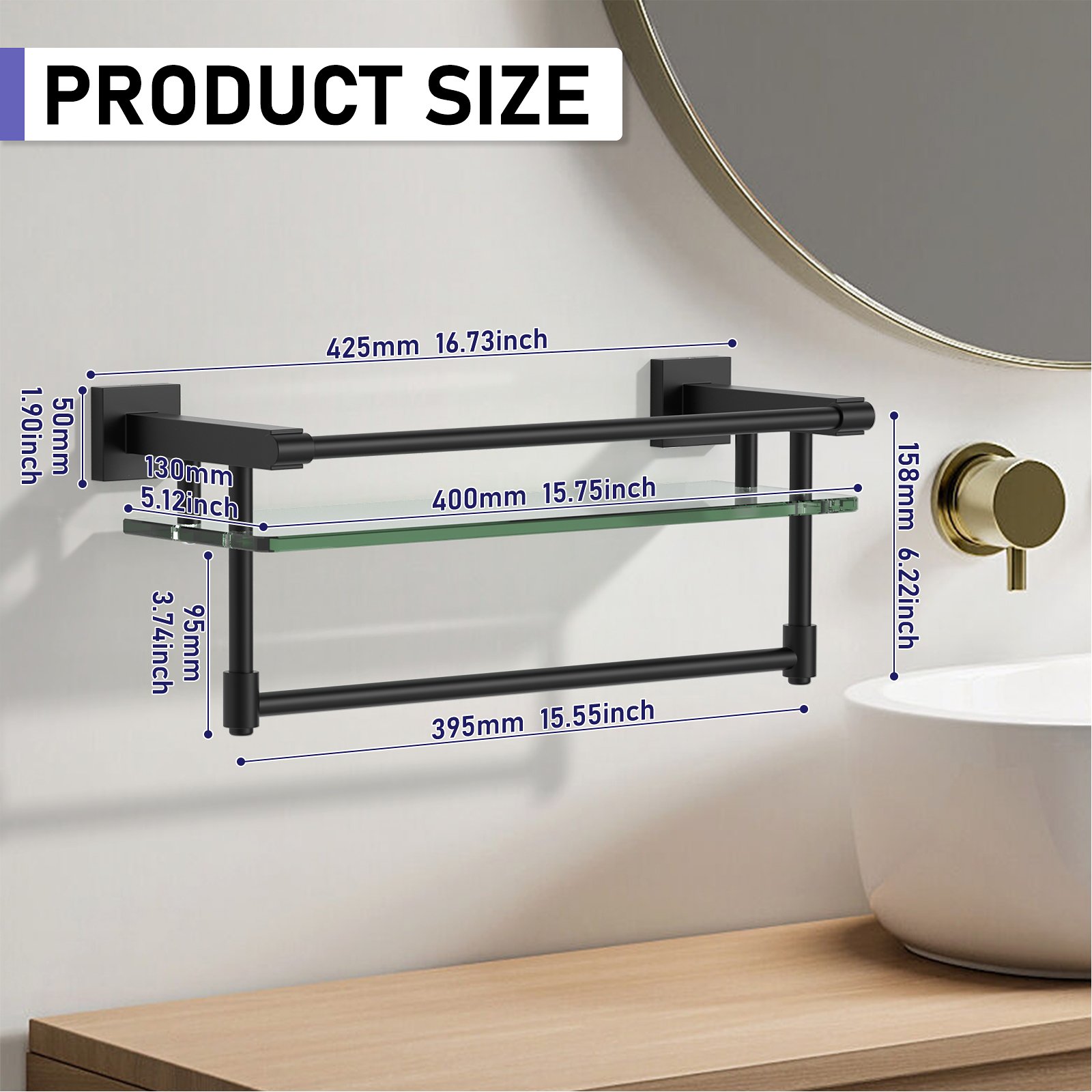 Designed for long-lasting use, this 16-inch hanging rod combines durability with sophistication. The high-quality glass shelf enhances the unit’s functionality, providing extra storage options for items like toiletries, decor, or small accessories. The sturdy hanging rod is perfect for holding clothes, towels, or other necessities without bending or sagging, ensuring reliability in everyday use.