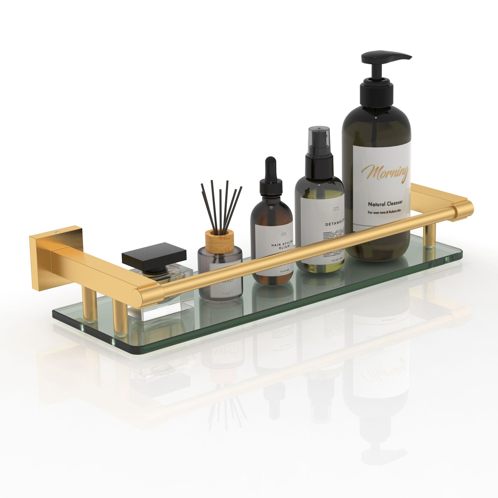 16-inch rodless glass shelf with brushed gold finish.16-inch rodless glass shelf with brushed gold finish.