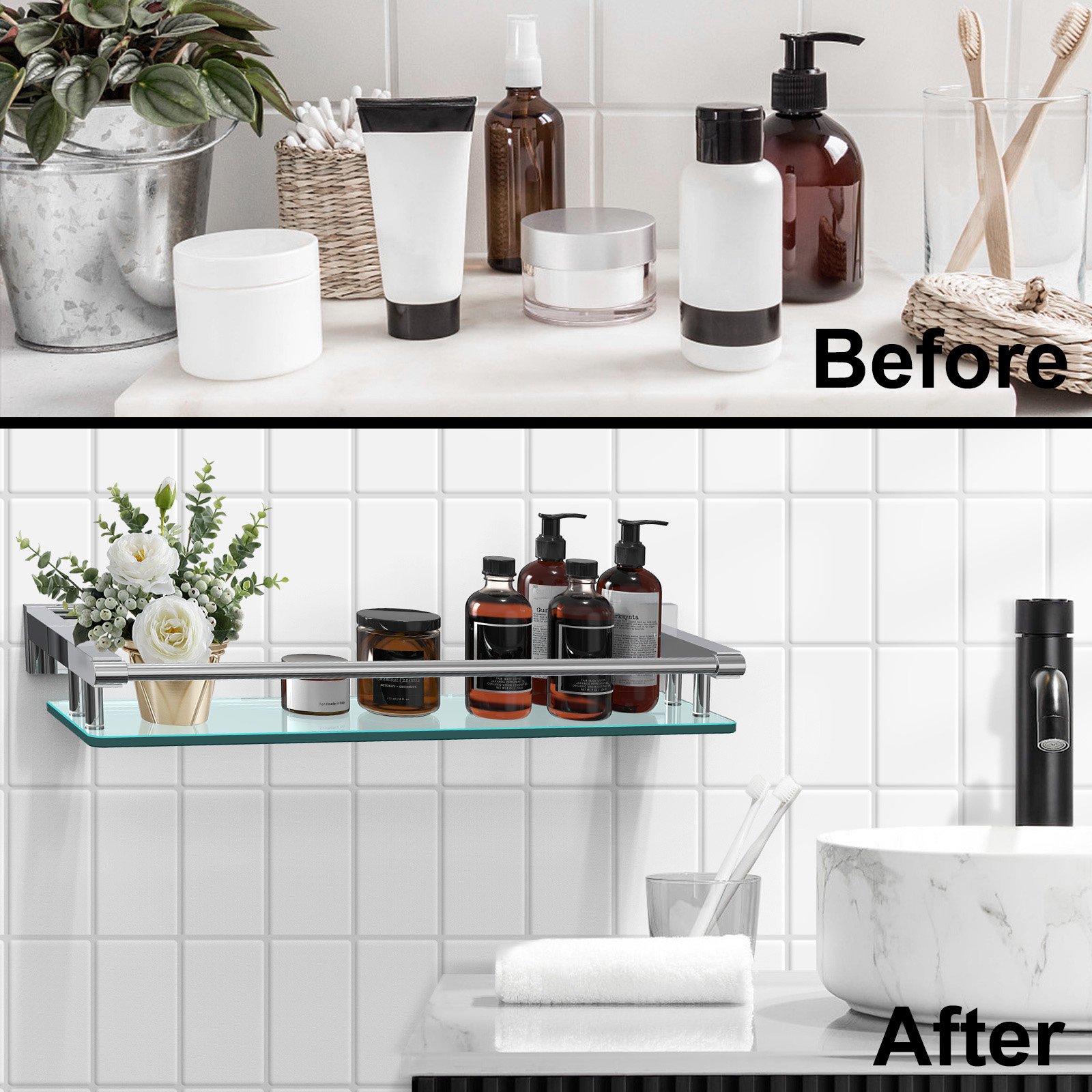 Crafted from durable chrome-plated metal, this glass shelf provides exceptional strength and resistance to wear over time. The chrome finish exudes a polished brilliance that enhances the overall elegance of the shelf while protecting it from corrosion. Whether you’re planning to install it in your bathroom, kitchen, or living room, this shelf is designed to maintain its premium appearance even in humid environments.