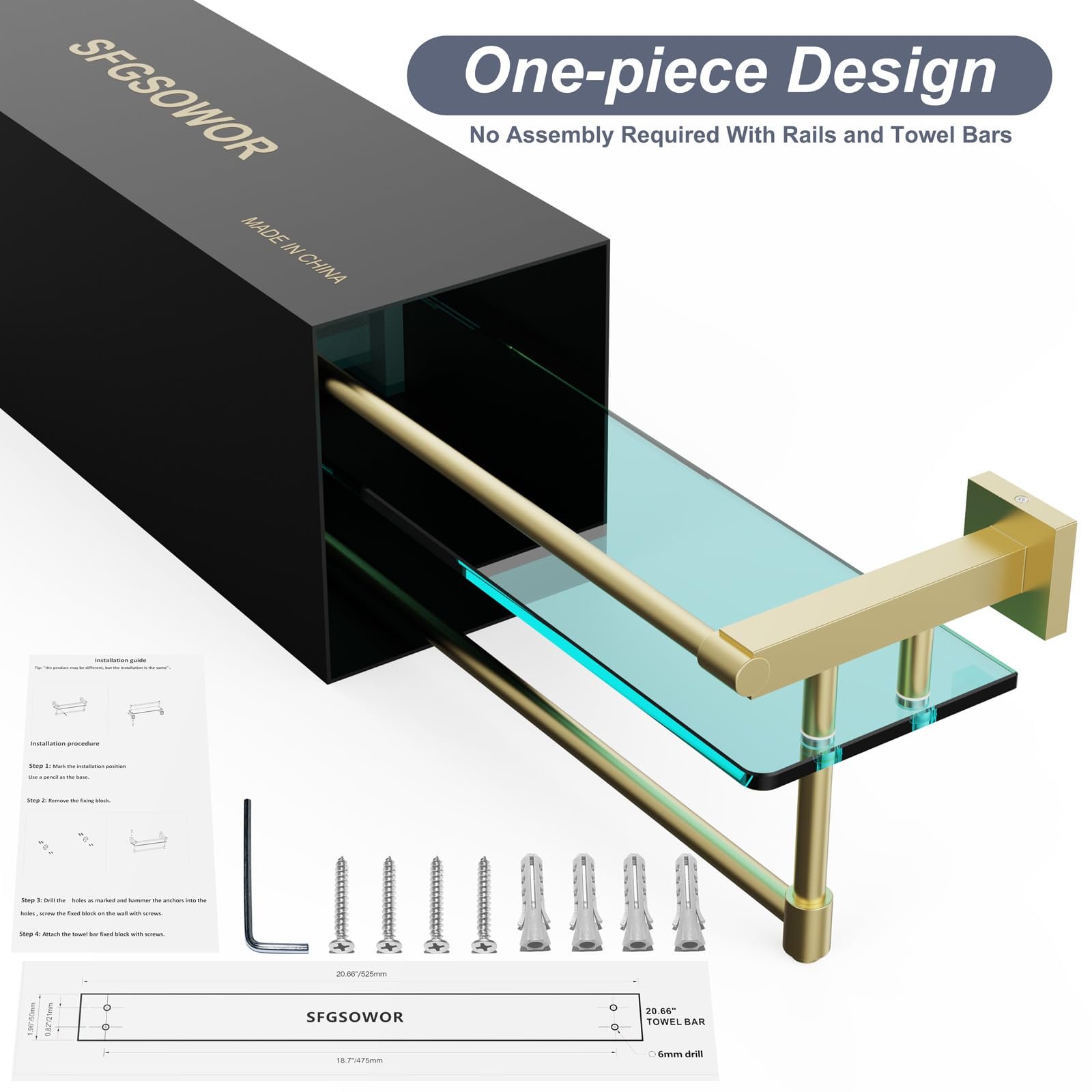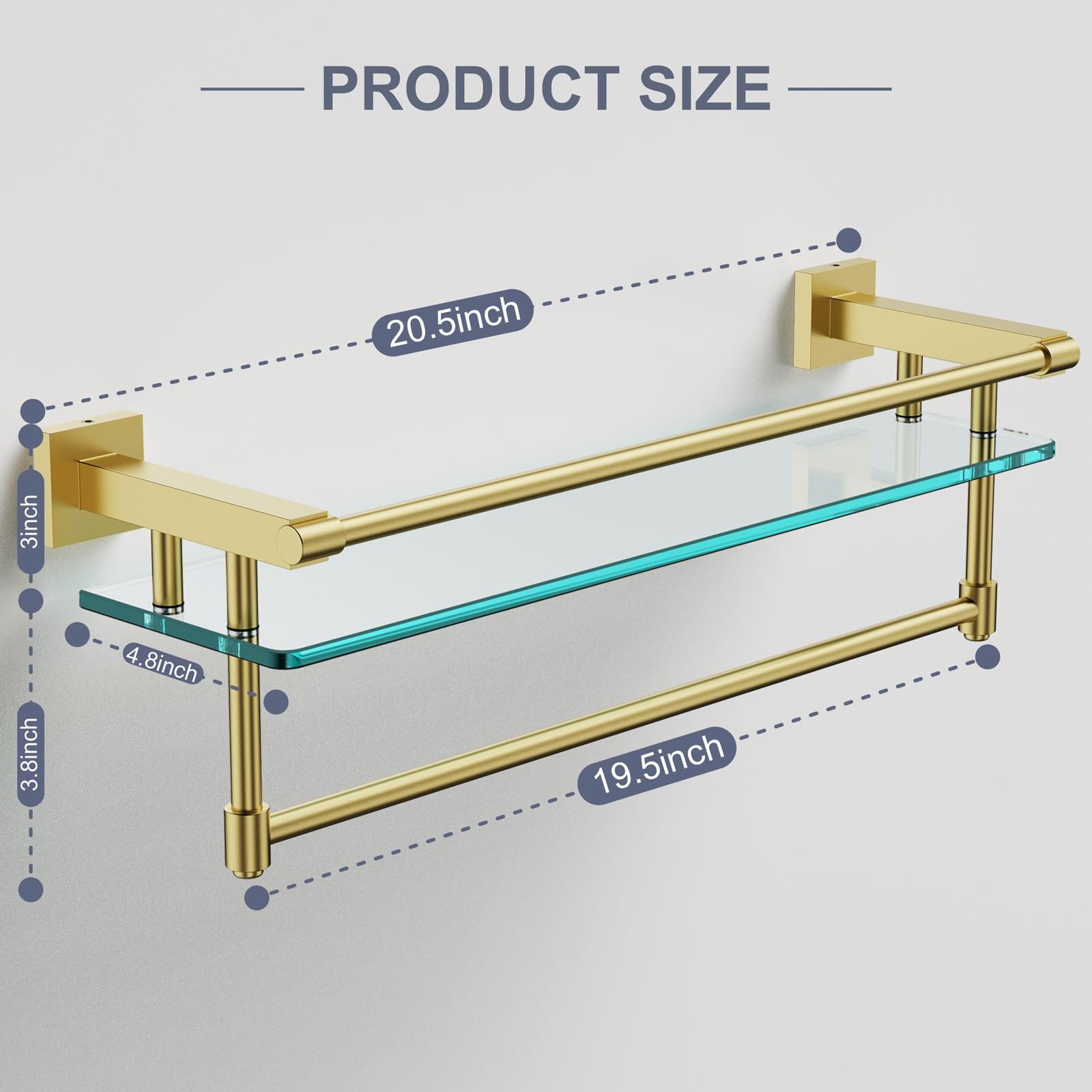 Crafted with precision, this hanging rod is designed to not only look stunning but also offer lasting performance. Its brushed gold exterior resists fingerprints and smudges, ensuring a clean and sophisticated appearance, even in high-traffic environments. The 20-inch length provides ample space for hanging items, such as coats, towels, handbags, or even clothing accessories. Coupled with a tempered glass shelf, this product offers additional storage without compromising on visual appeal. Use it to organize essentials or showcase decorative items, blending convenience and style effortlessly.