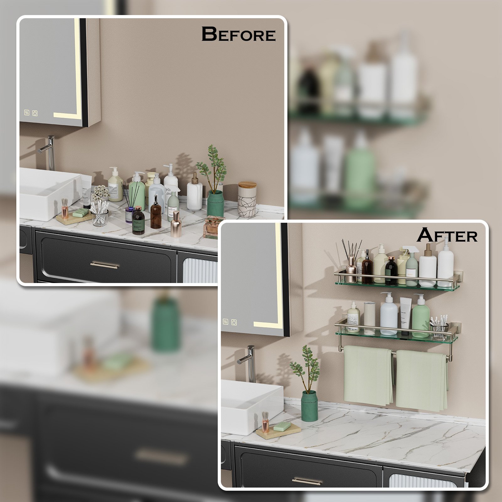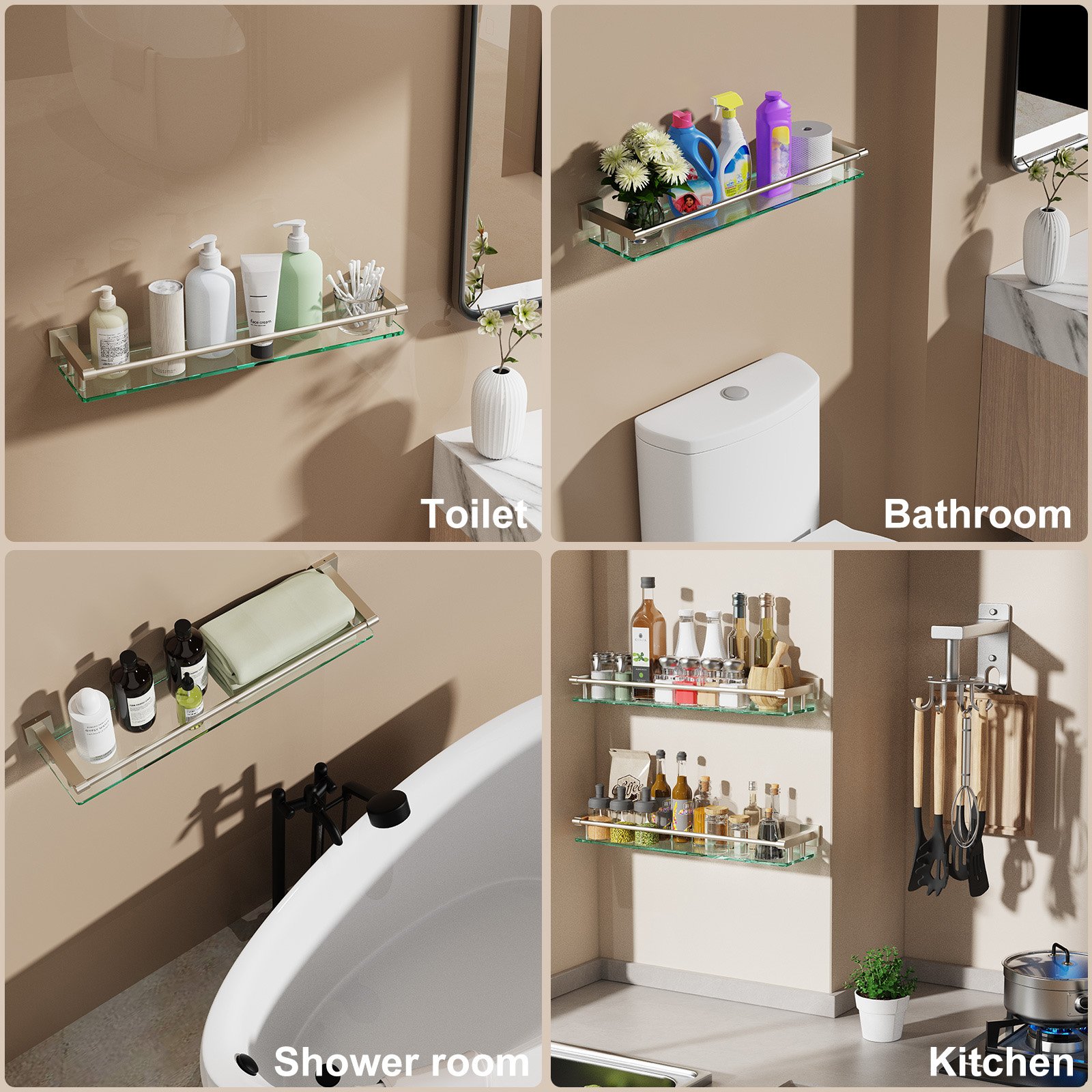 Crafted from high-quality tempered glass, this rodless shelf is not only visually stunning but exceptionally strong and durable. Its expertly engineered design eliminates bulky hardware, creating a sleek and unobtrusive appearance. The sturdy construction ensures it can support various items, from toiletries and decorative pieces to kitchen essentials, making it a versatile storage solution.